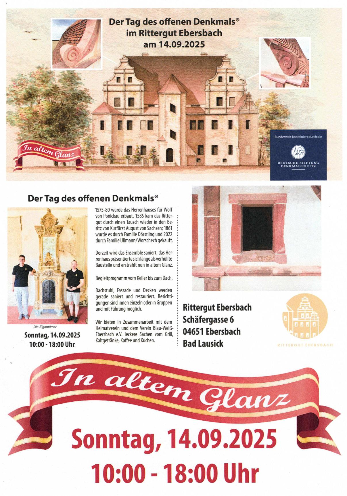 Zum Tag des offenen Denkmals kann das Rittergut mit Herrenhaus und Park in Abhängigkeit von den Baumaßnahmen besichtigt werden. Im Park gibt es die Möglichkeit, einen kleinen Imbiss (Gegrilltes/Kuchen) und Getränke zu bekommen.